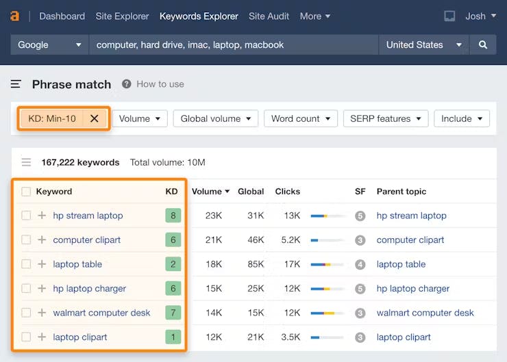 KD score below 40: Keywords that are the most straightforward to rank for. They have low search volume or extremely particular search intent.