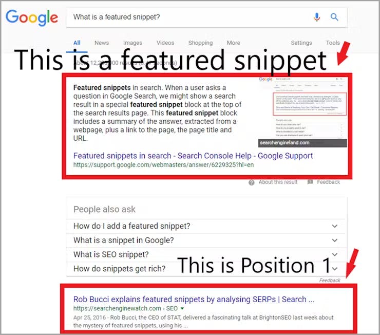 Featured Snippets (Position Zero) are the boxes that appear at the top of the SERP and provide answers directly.