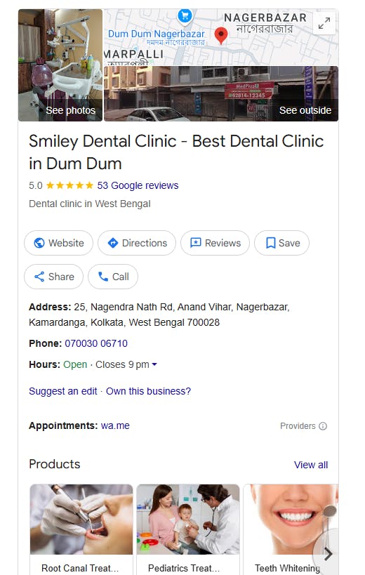 For example, take a look at how SEO experts from the top Digital Marketing Company in Kolkata helped our client Smiley Dental Clinic achieve the #1 rank for the keyword “Best Dental Clinic in Nagerbazar” after GBP optimization with relevant keywords!